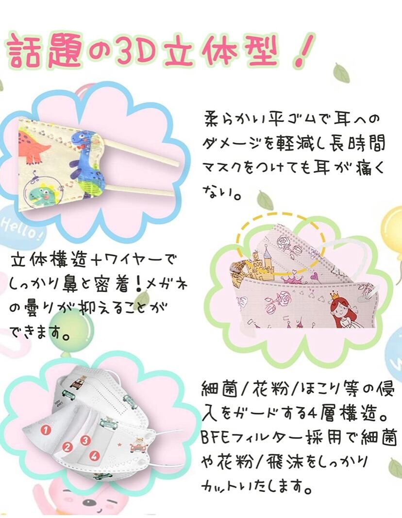 マスク史上最多色セット 子供 絵柄 5色混色セット 50枚 カラーバリエーション豊富 KN95立体マスク 蒸れない 息しやすい コロナ対策 4層構造